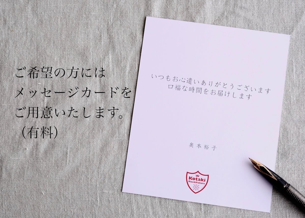 新米(ライスヌーボー)の時期に楽しんでいただくコタキヌーボーは、お友達へのプレゼントにも最適です。毎年完売になる人気のボトルですので是非一度おためしください。